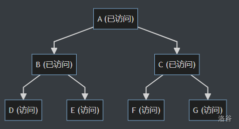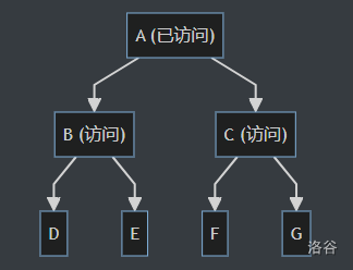 接下来访问 A 的子节点 B 和 C。将 B 和 C 的值添加到结果字符串中,并将它们的子节 D、E、F 和 G 加入队列。
